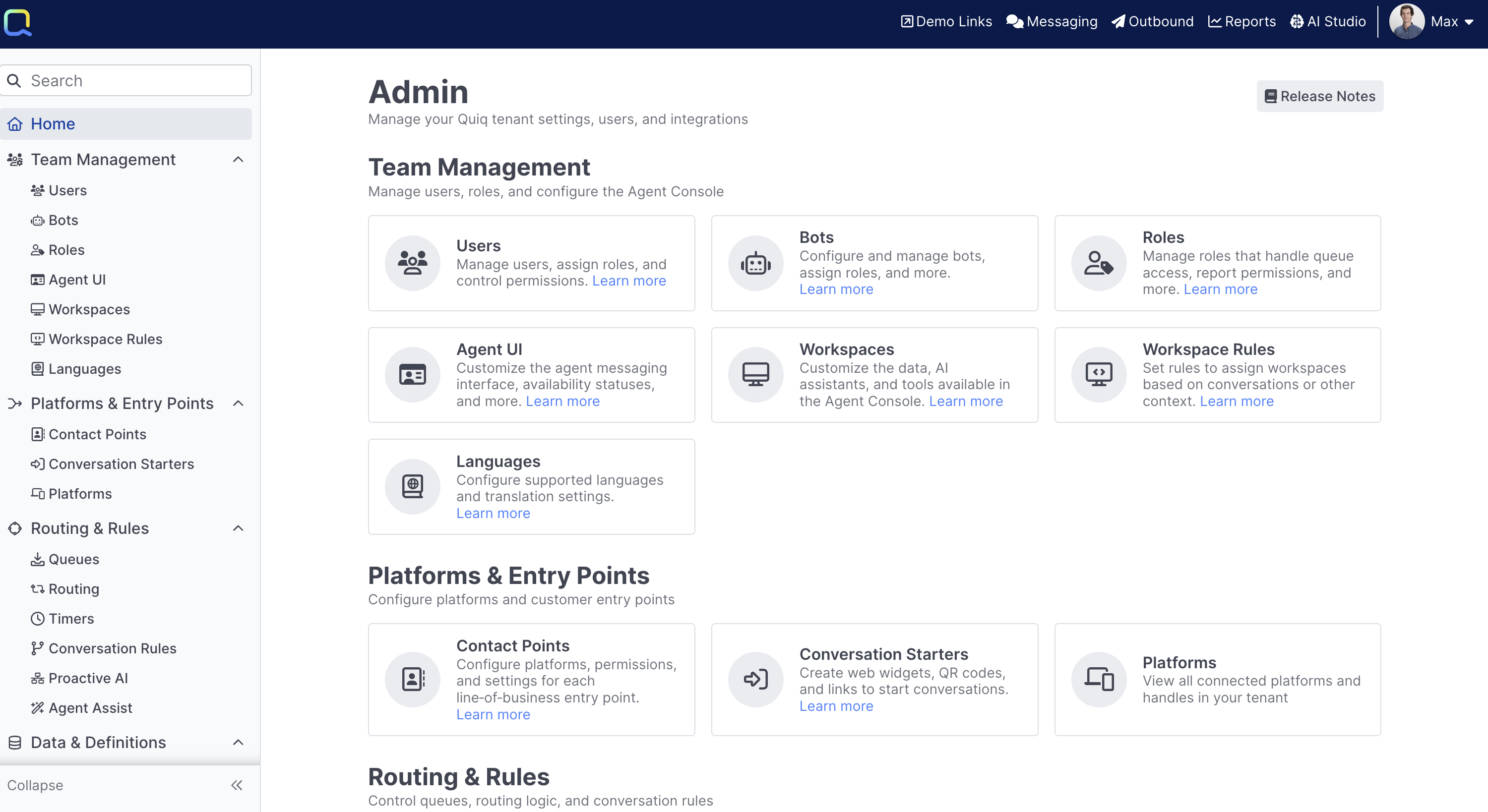 Admin permissions should only be granted to trusted individuals, as the most sensitive configuration of the Quiq system is available to Admin users.