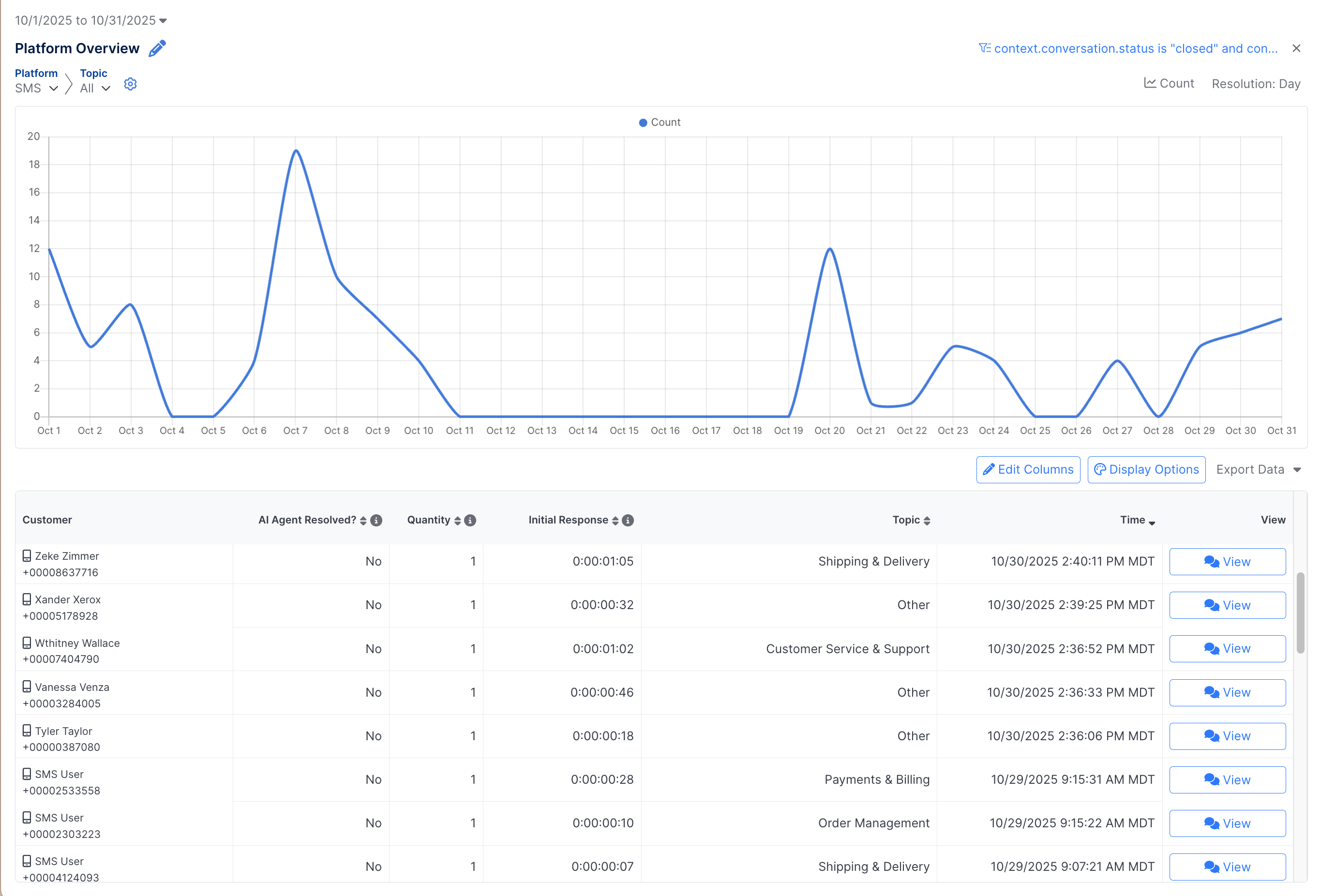 1. Customer: The customer first and last name (if available) along with the phone number (when applicable). The image for the platform of the conversation will also be included.
