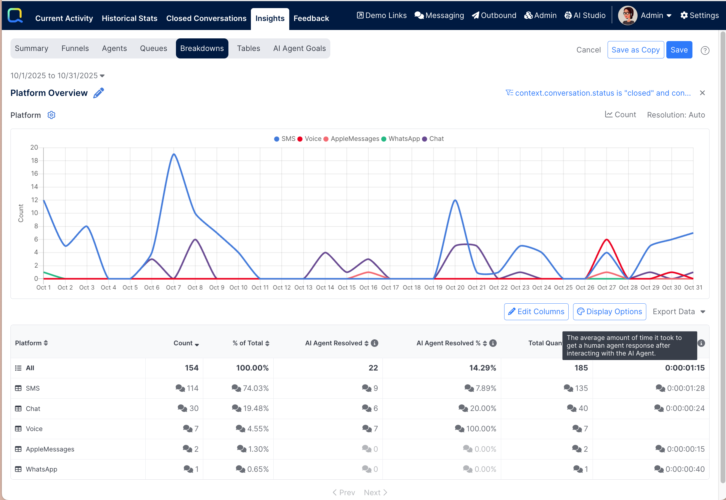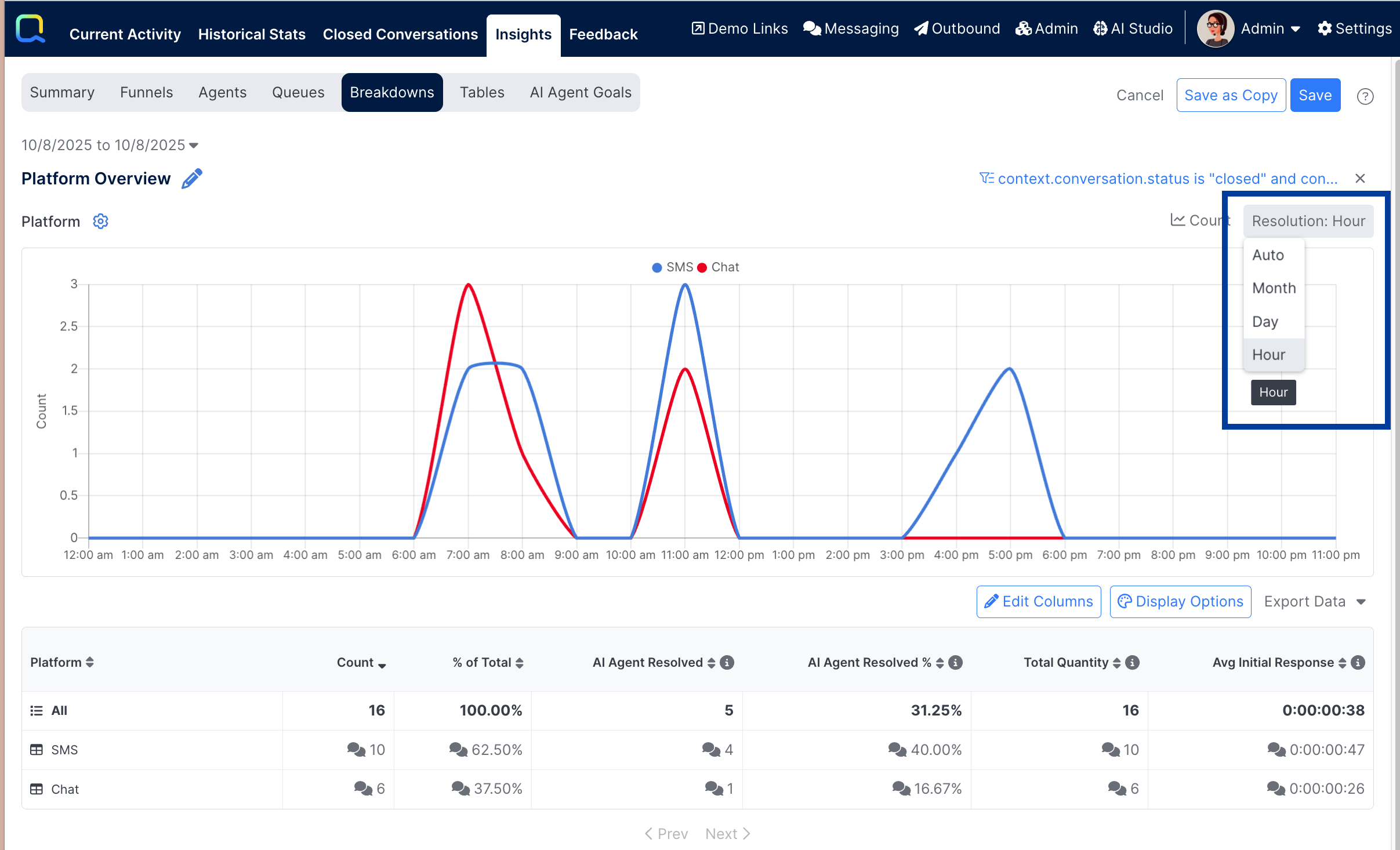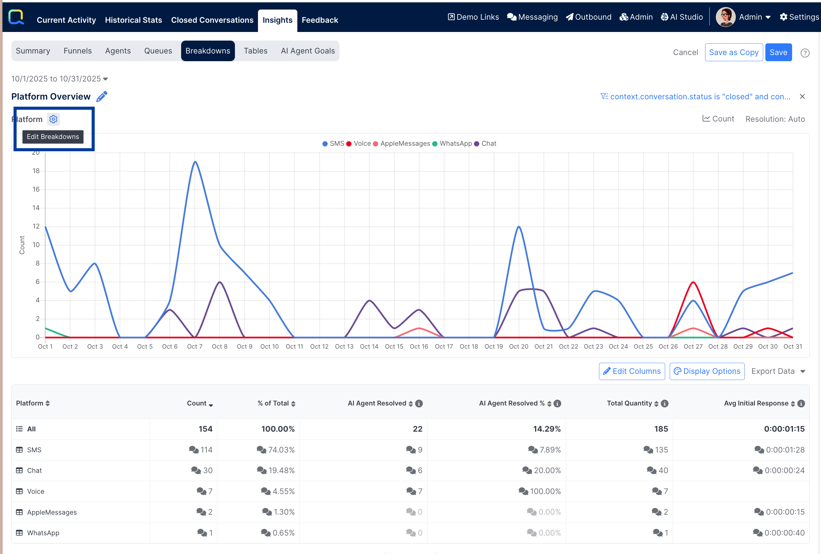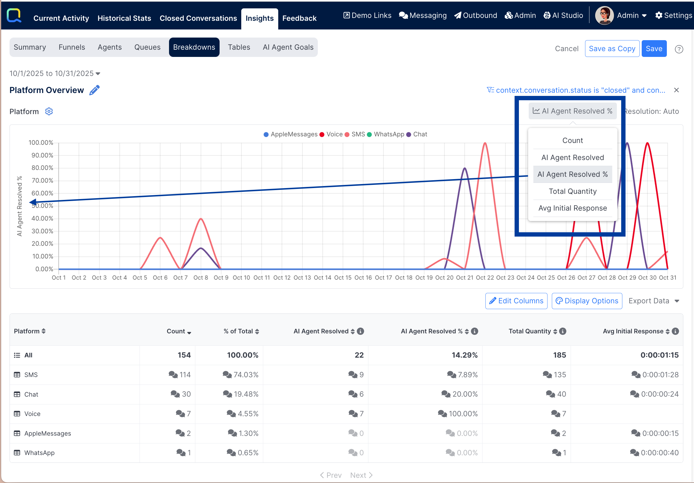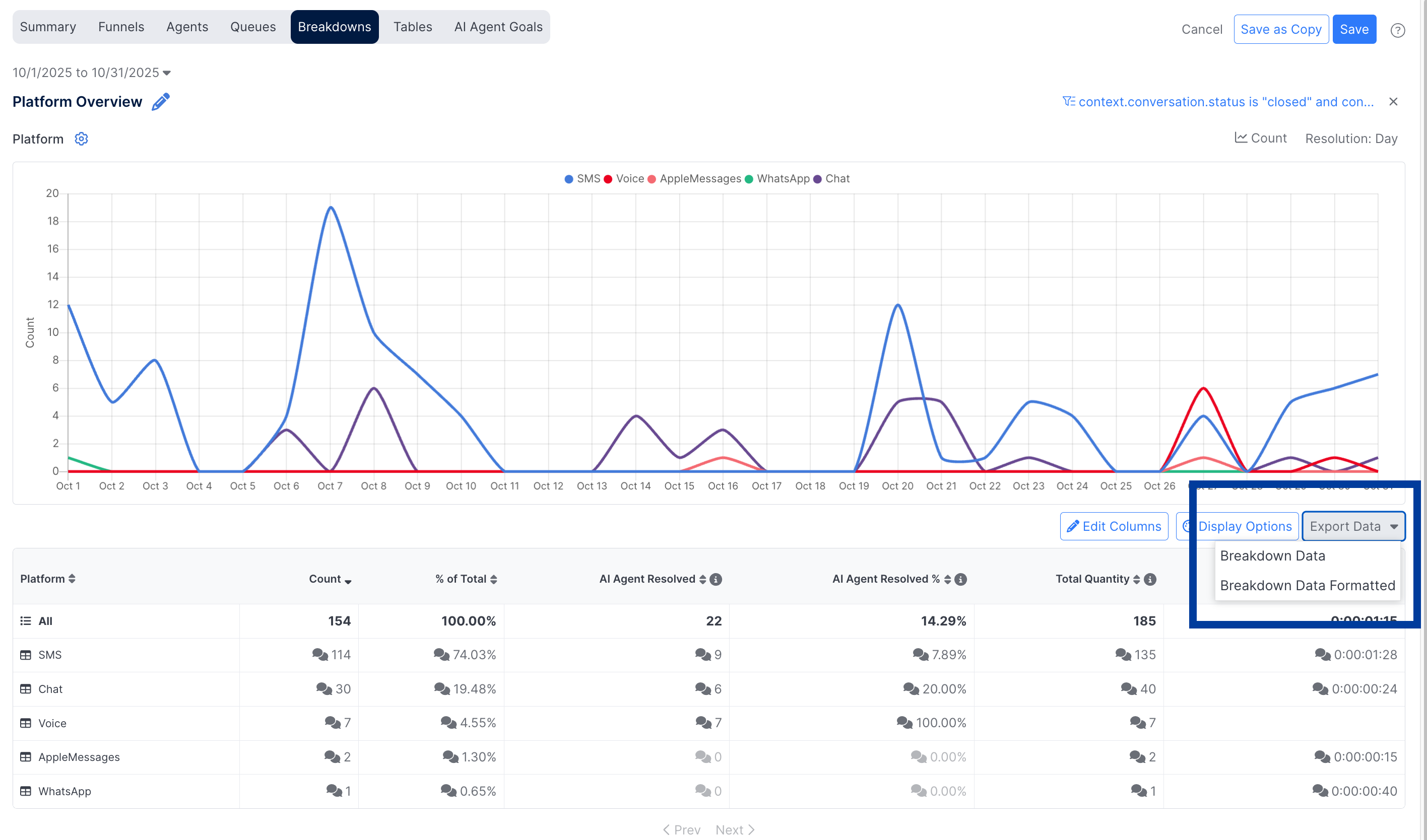 Every breakdown report will be automatically configured to show a metric of Count to show the total number of events (e.g. Conversations Ended) that occurred during the selected timeframe. Additional metrics can be added as well.