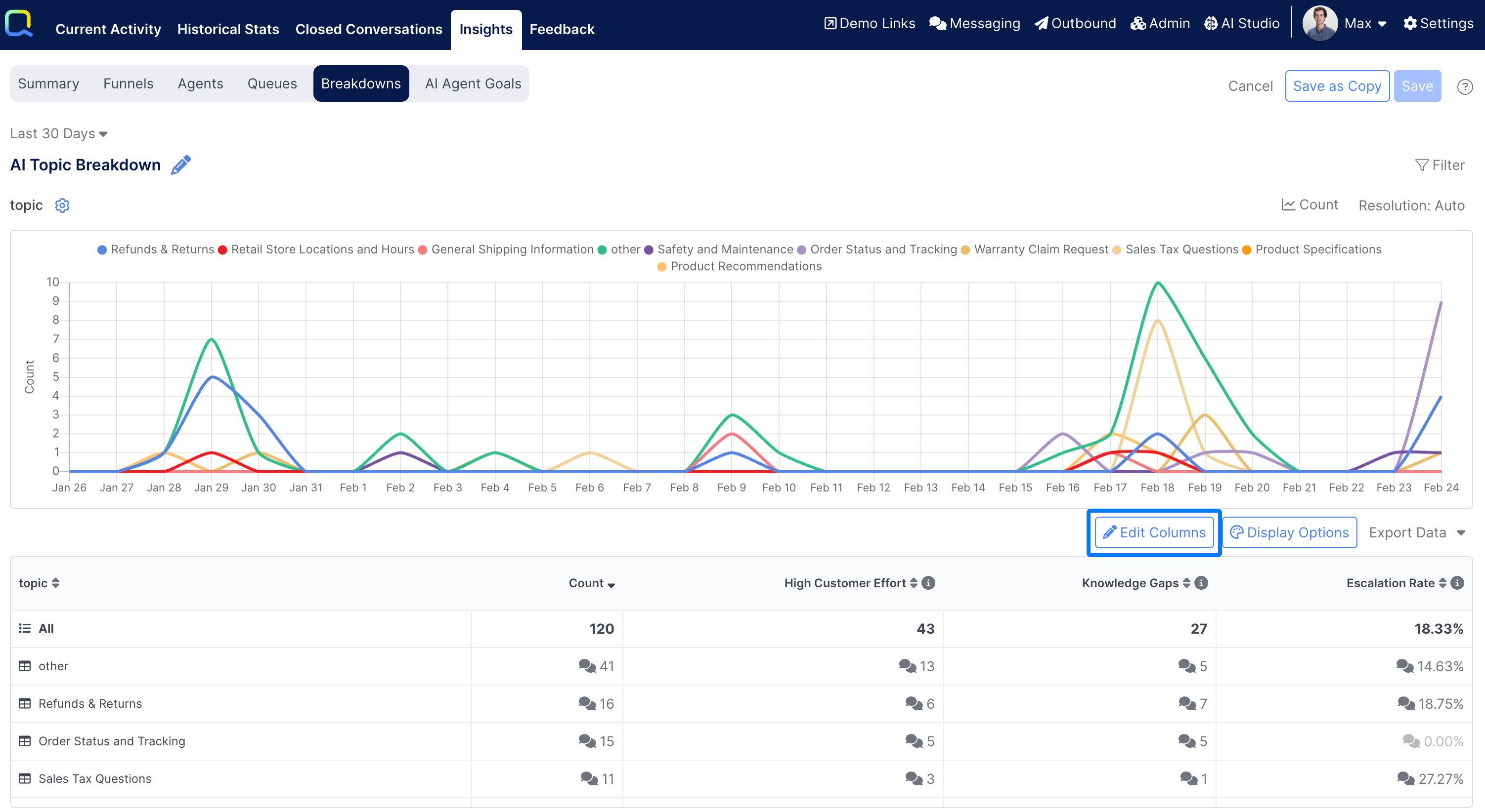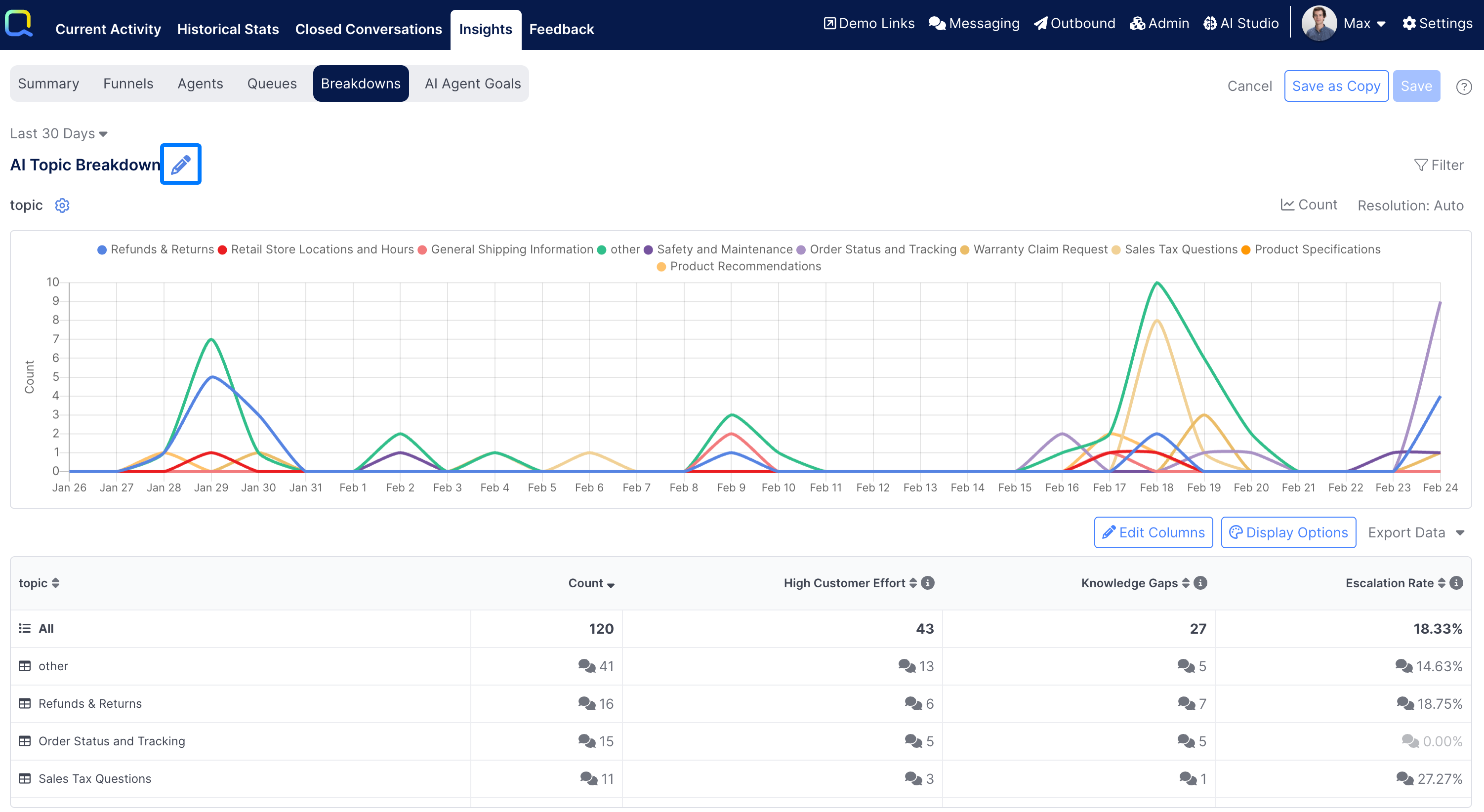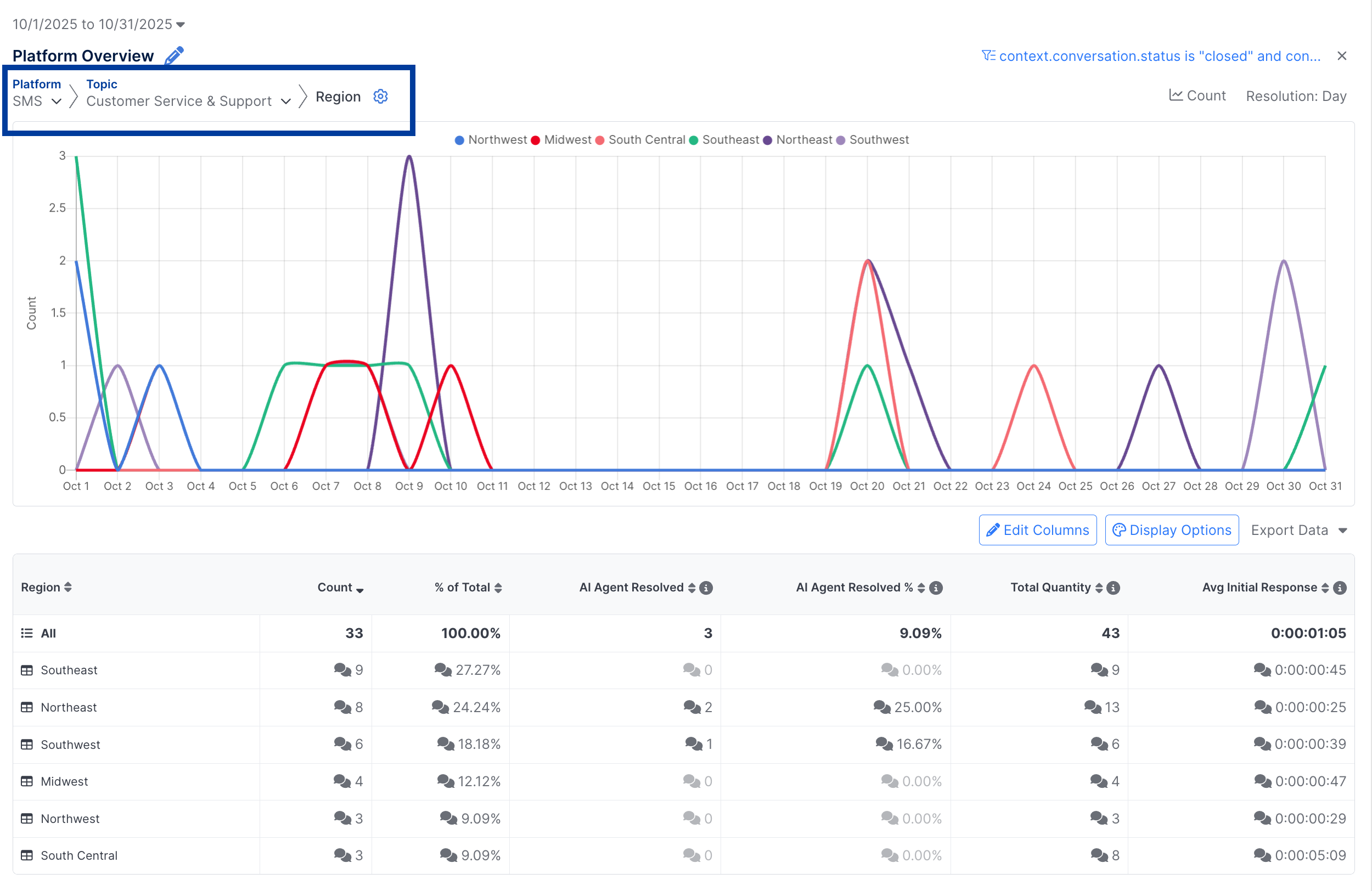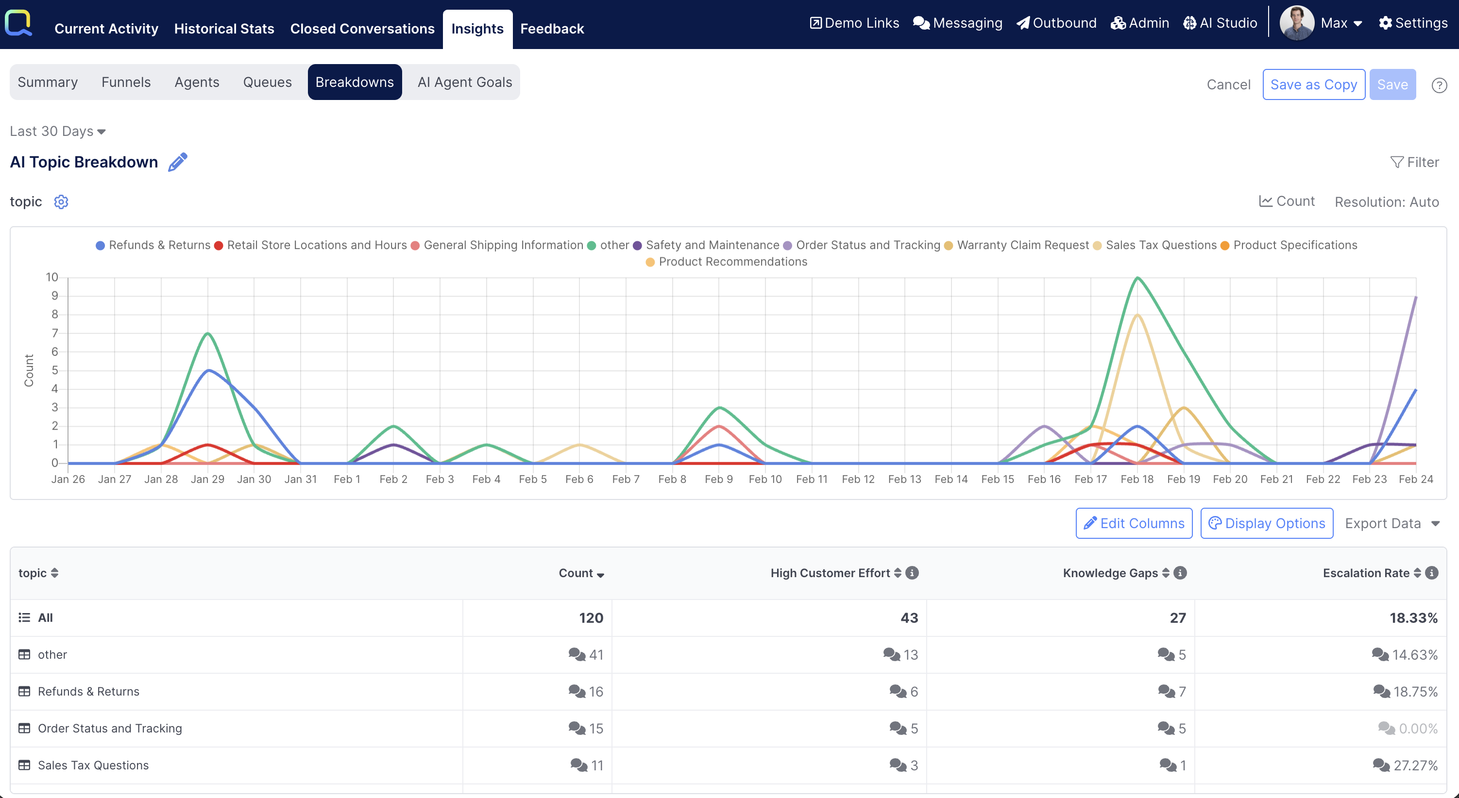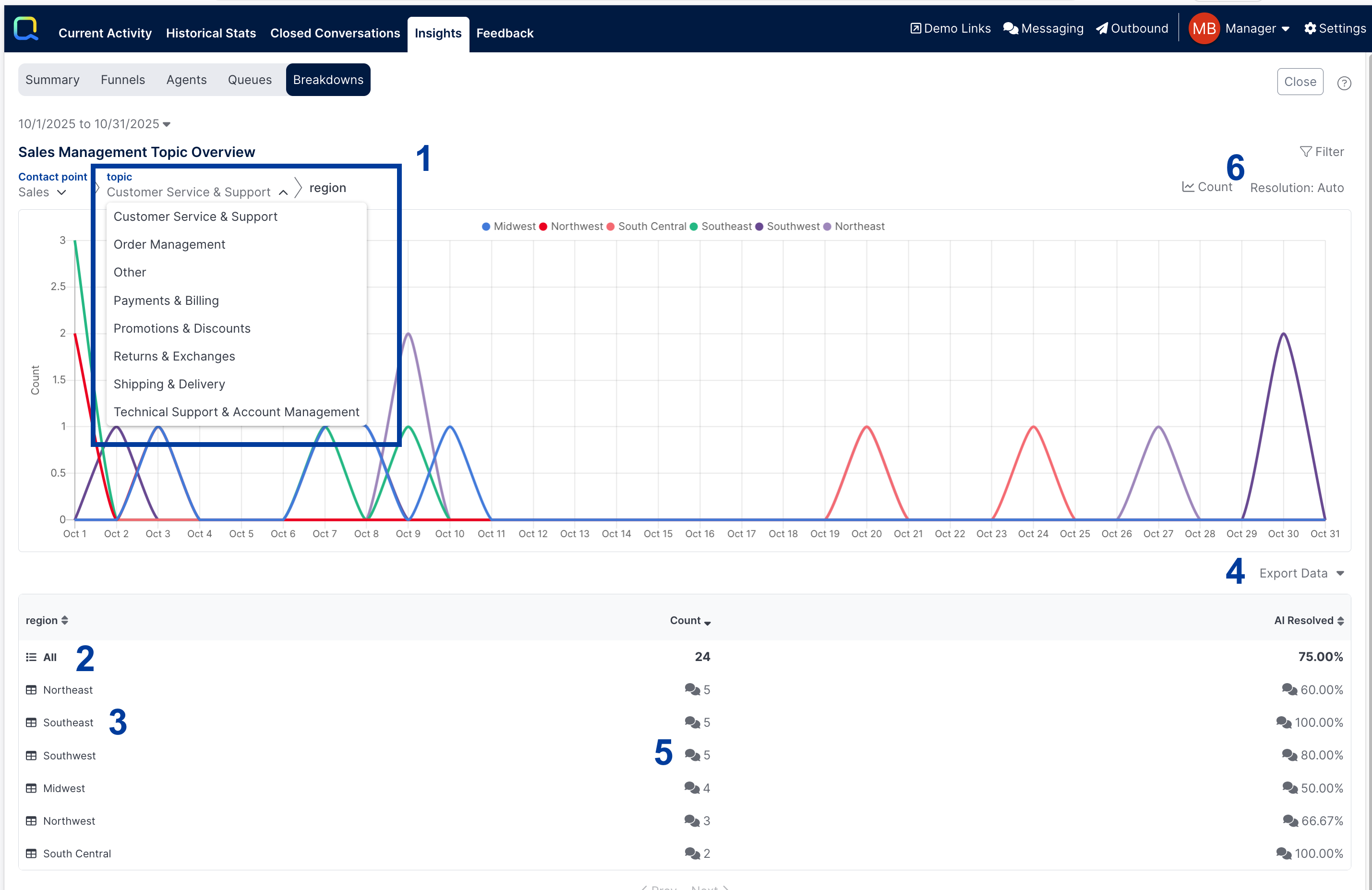 Every breakdown report will be automatically configured to show a metric of Count to show the total number of events (e.g. Conversations Ended) that occurred during the selected timeframe. Additional metrics can be added as well.