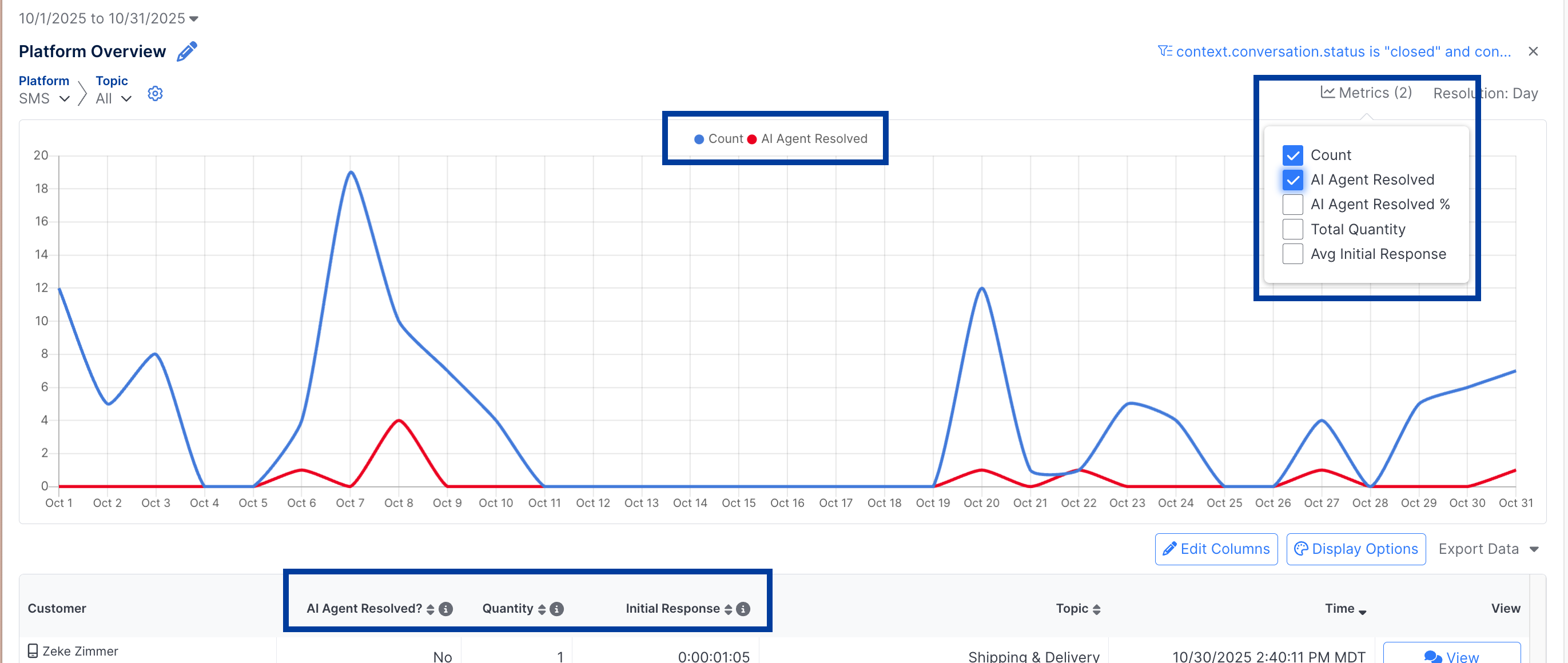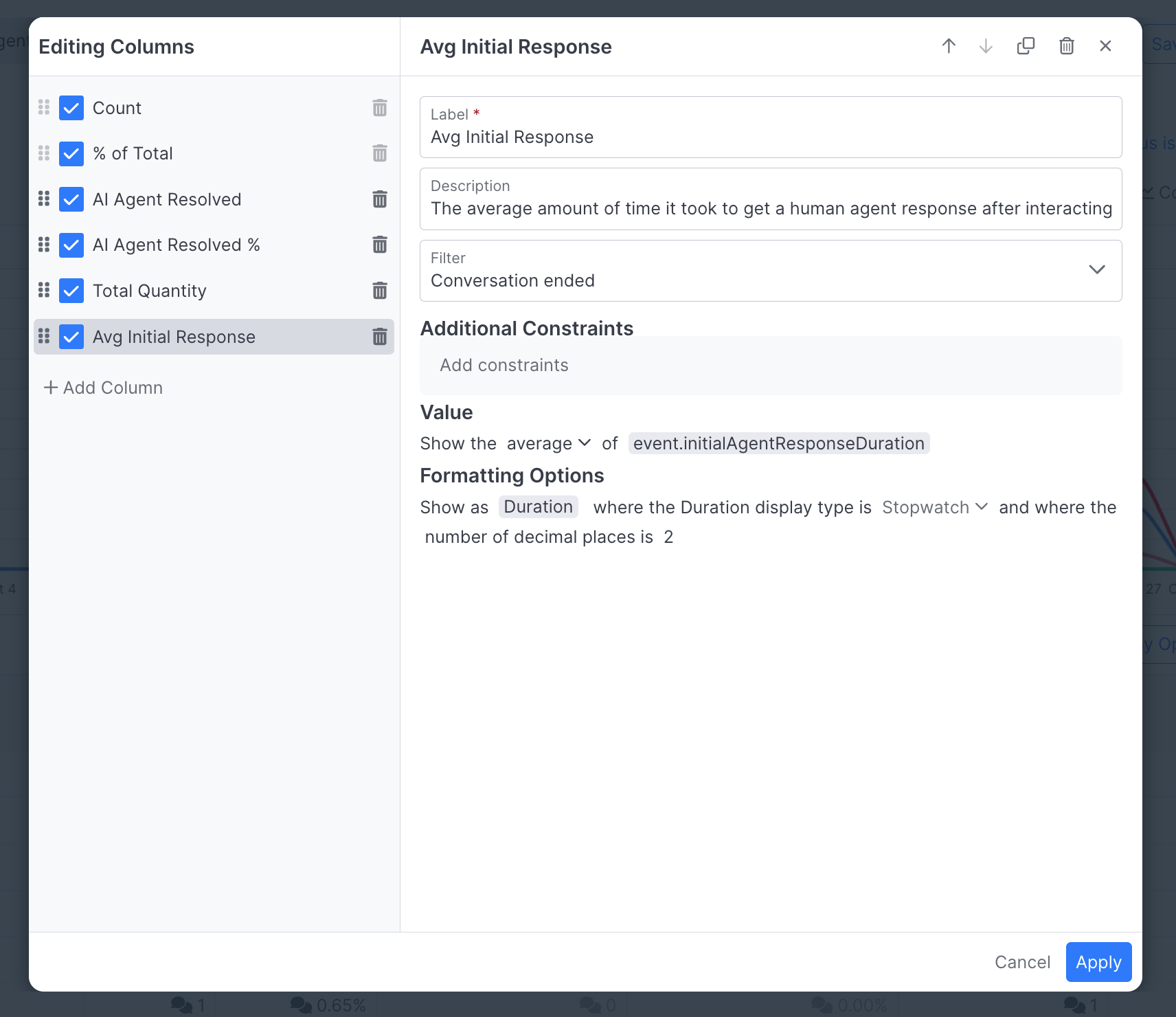 In this example, both AI Agent Resolved and AI Agent Resolved % are always going to return the same value since they are representing the same conditions; one as a number, and the other as a percent. You can delete one since having both is redundant.