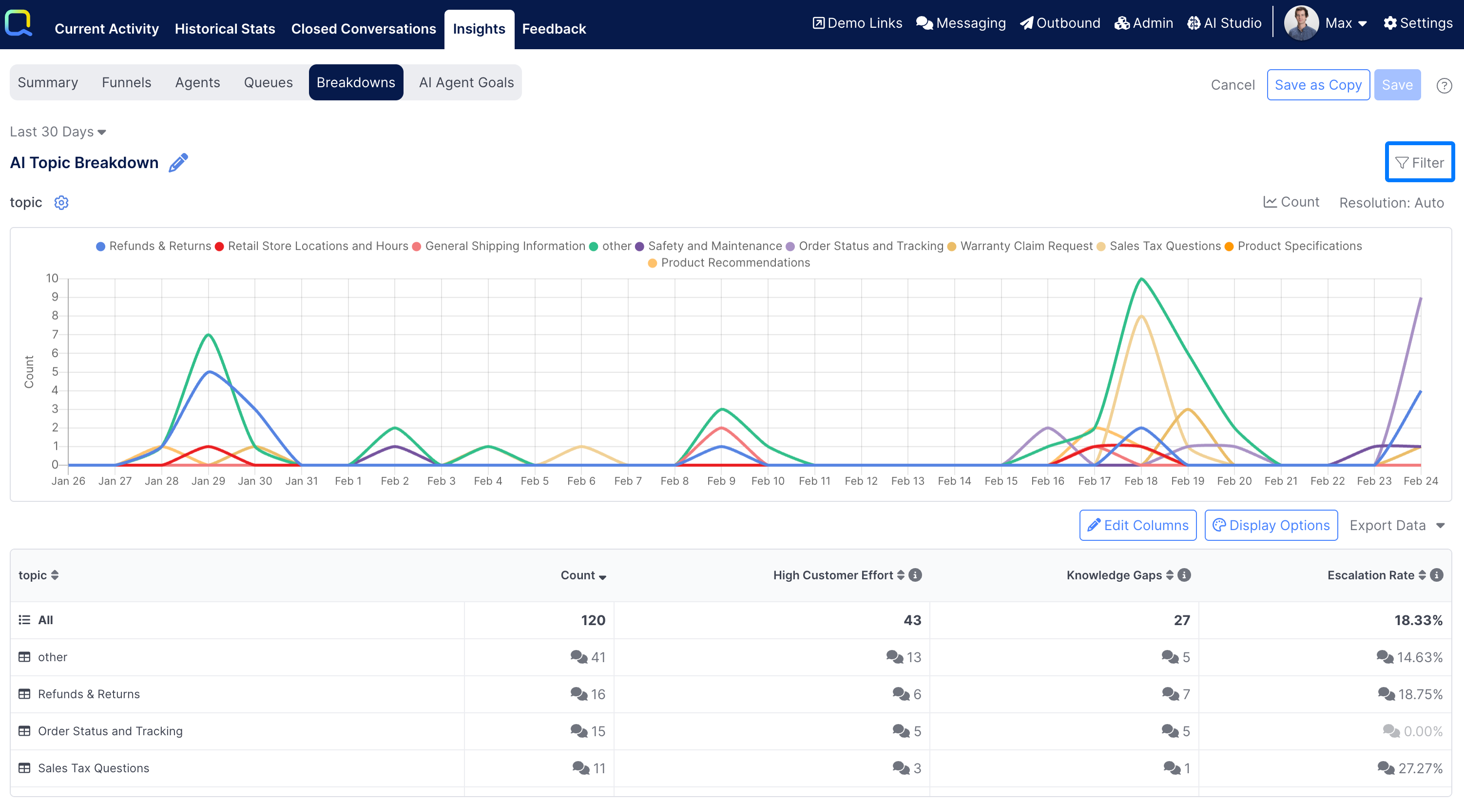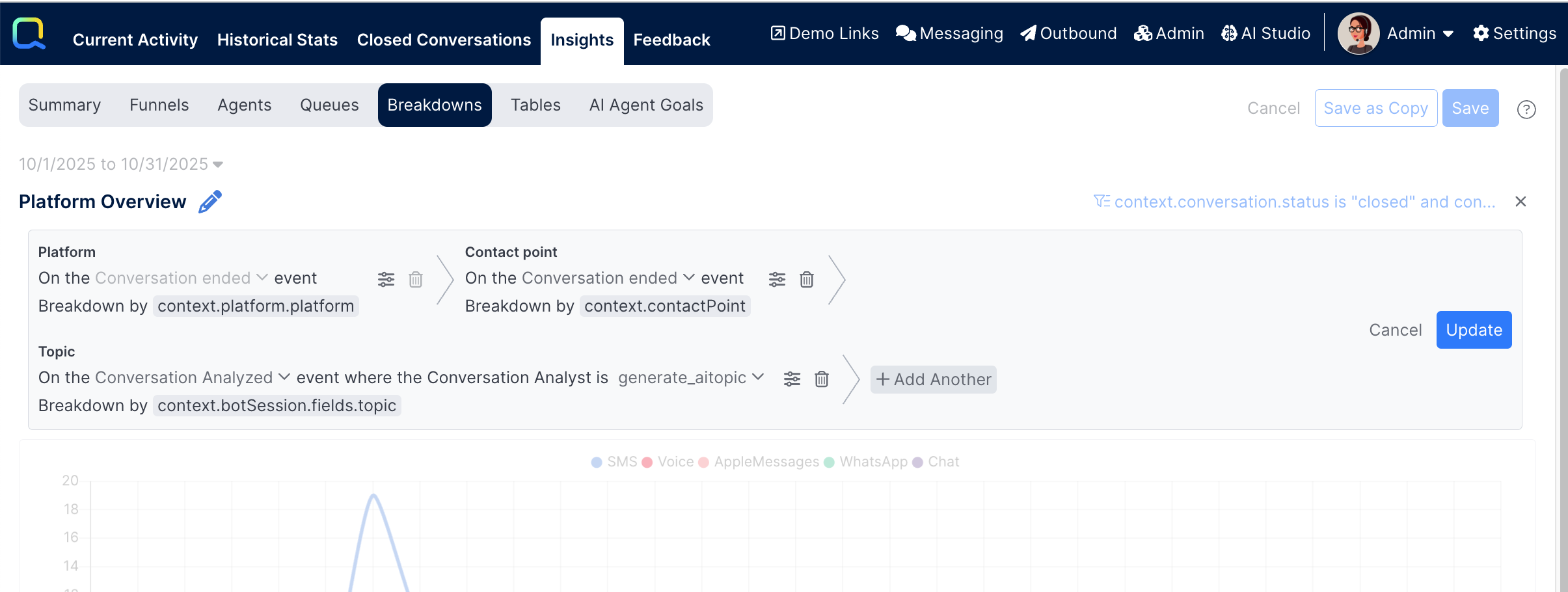 Breakdown Insights allow Quiq Administrators and Managers to develop reports providing a set of metrics and KPIs grouped by some defined category. Agent Insights and Queue Insights are available as standard reporting to display performance metrics grouped by agent or queue. Now, other reports can be customized to show data broken down by some other piece of data - the topic set by a Conversation Analyzer, a contact point, a platform, a custom field or a property on a custom event. The user can then drill in to breakdown the data further by other pieces of information.