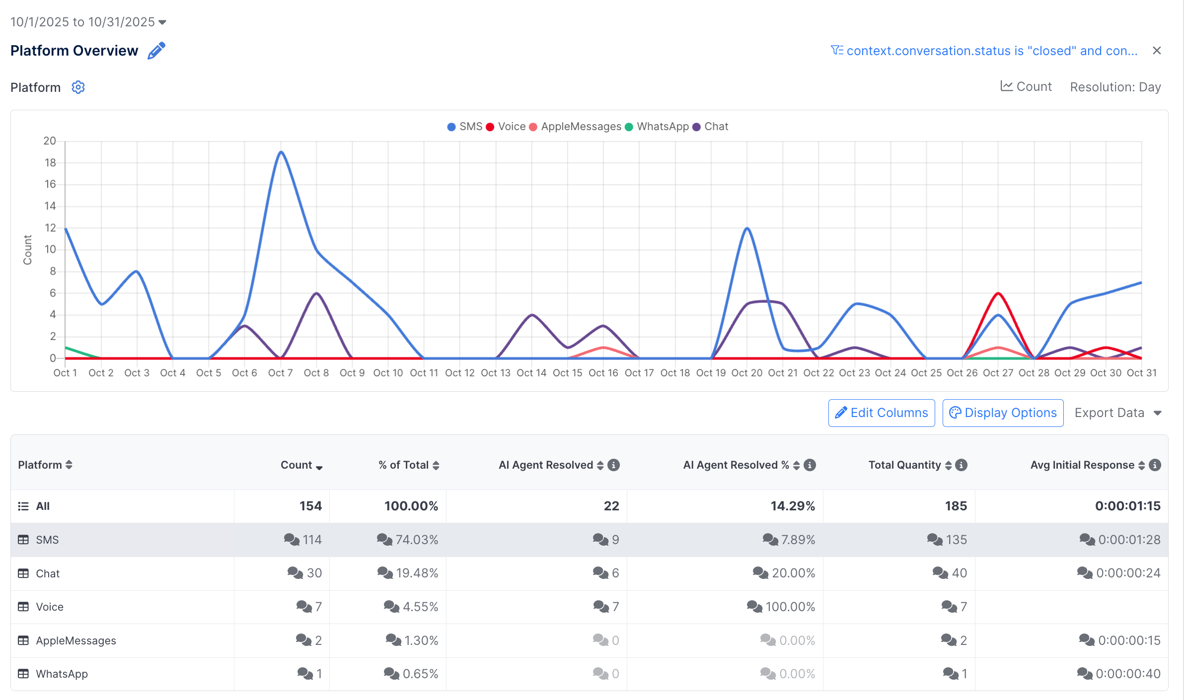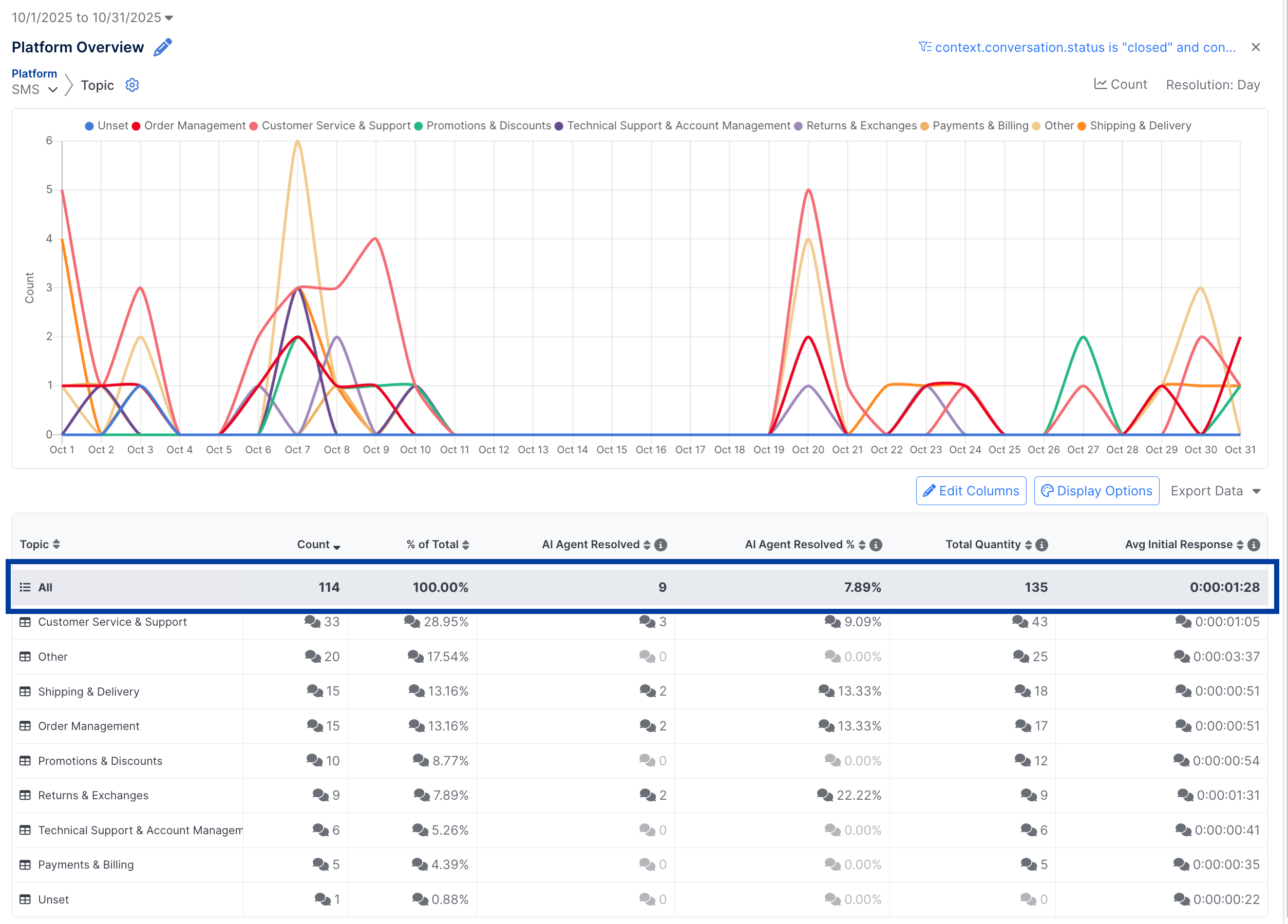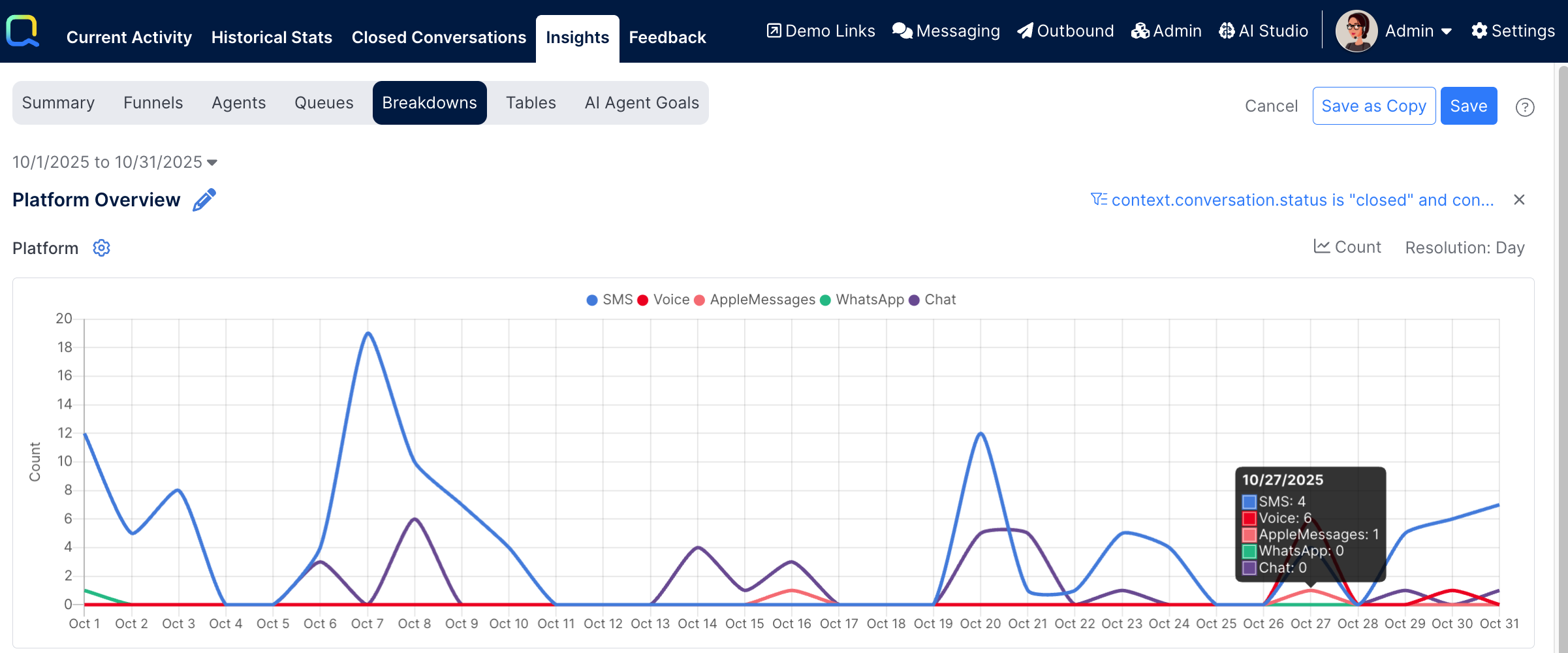 For example, the admin may want to only look at conversations that were Closed (not those that were marked as Spam or Abandoned), or they may want to include only non-survey conversations.