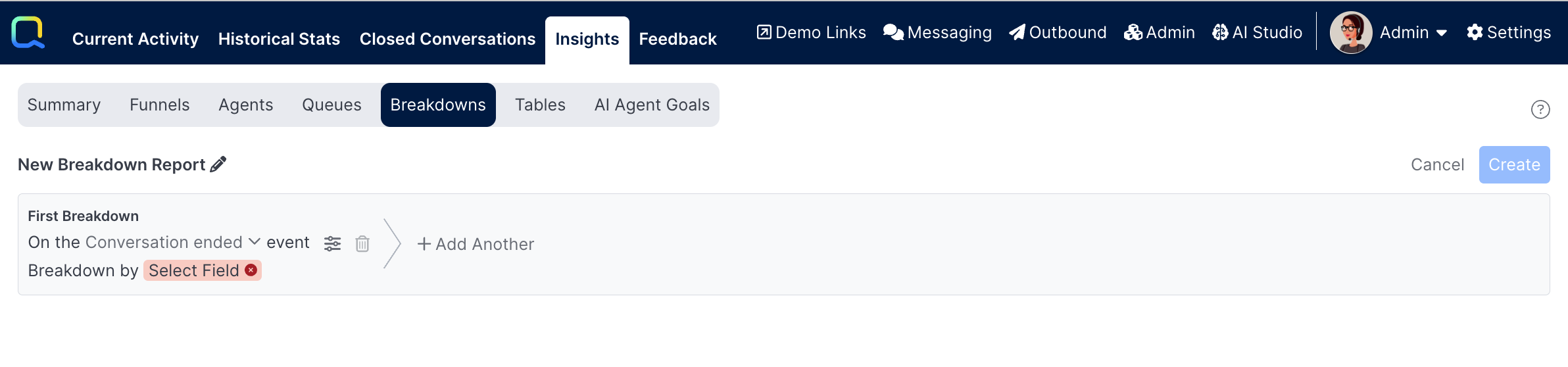 The Reports > Insights > Breakdowns tab provides a list of reports that have been previously configured and are available to the user - similar to what is seen in the Funnels or Agents subtabs.