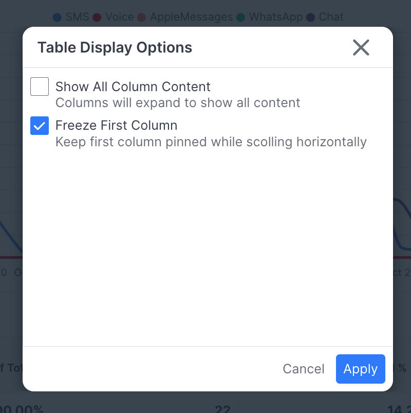 - Label: The column heading that appears in the table, and the name of the metric that can be selected in the chart. Label is required and should be unique for each column in the report.
