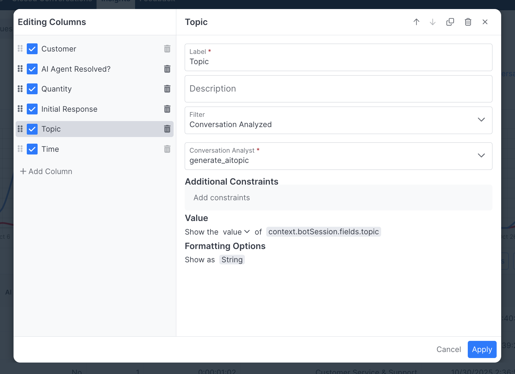 When done defining columns, select the Apply button in the lower right corner of the dialog to show the new columns in the Report.
