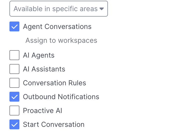 WorkspacesIf Workspaces are enabled, you will see the option to assign to specific Workspaces under the Agent Conversations Availability checkbox . For help enabling Workspaces, please reach out to your CSM or email [email protected]