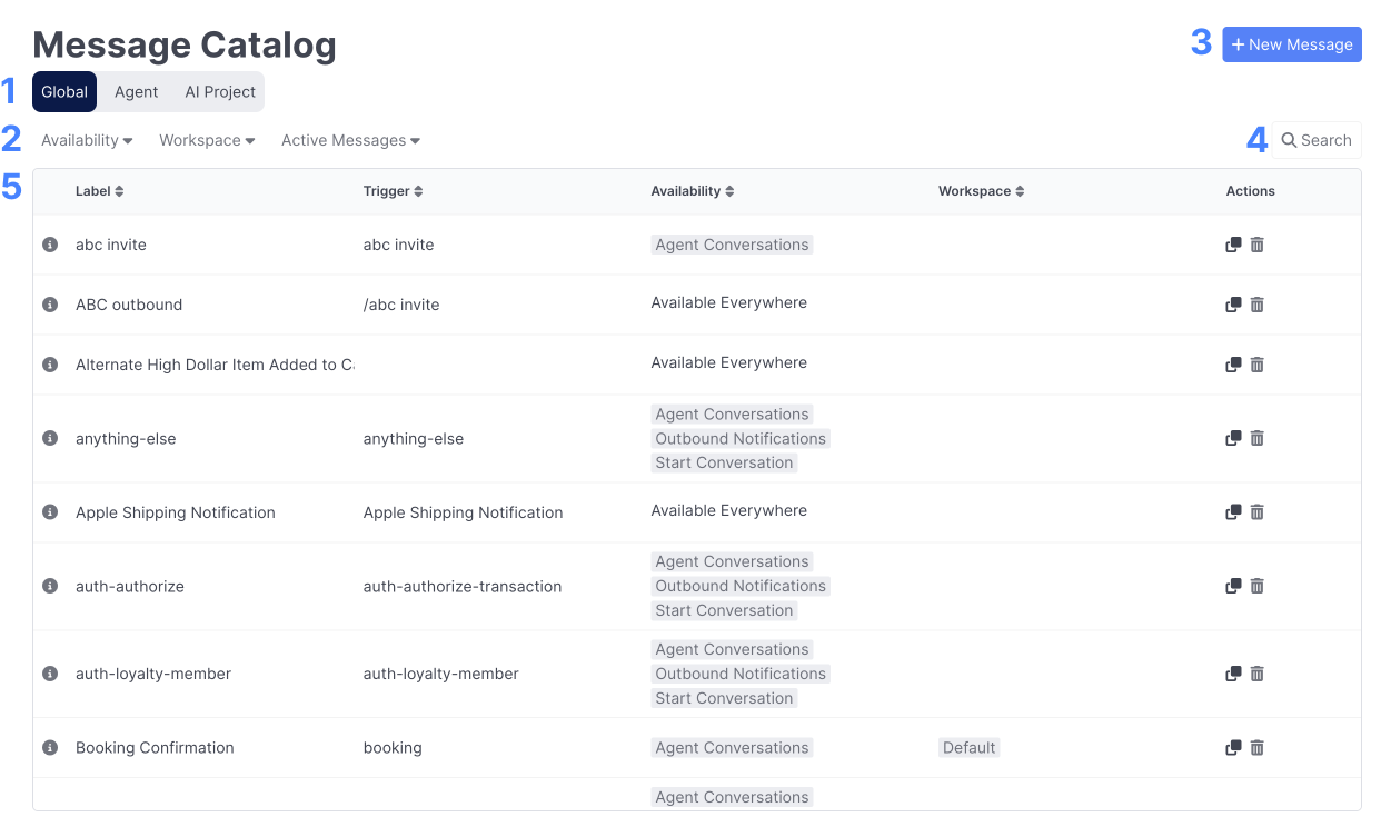 5. Sort by message label, trigger, availability, Workspace, and easily delete or duplicate Catalog Messages