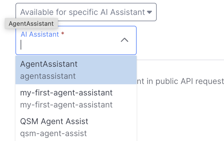 When Available for a specific AI Agent or AI Assistant is selected, you'll need to select the Assistant or Agent who has access to this Message.